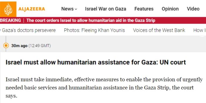 卡塔爾半島電視臺(tái)稱,國(guó)際法院責(zé)成以色列采取更多措施保護(hù)巴勒斯坦人,但沒有命令其結(jié)束在加沙地帶的軍事行動(dòng)。此外,國(guó)際法院要求以色列在一個(gè)月內(nèi)就其已采取的行動(dòng)向國(guó)際法院提交報(bào)告。