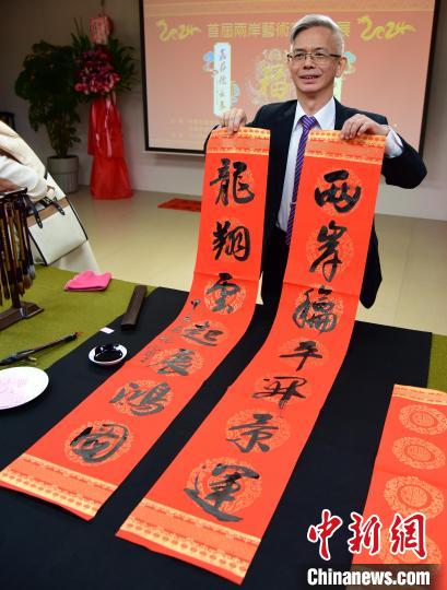1月28日,兩岸藝術(shù)家春聯(lián)展在臺北江山如此多嬌藝術(shù)館舉行。圖為臺灣中華書道學(xué)會理事長楊旭堂當(dāng)場揮毫?xí)鴮憽皟砂逗推介_景運,龍翔云起展鴻圖”。中新網(wǎng)記者 路梅 攝