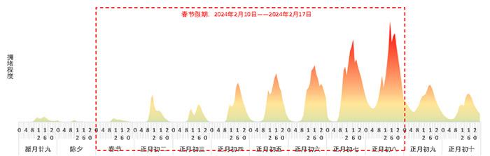 此外,春節(jié)期間出程與節(jié)日后期返程的潮汐特征明顯,9-12時和14-19時為易發(fā)生擁堵時段。
