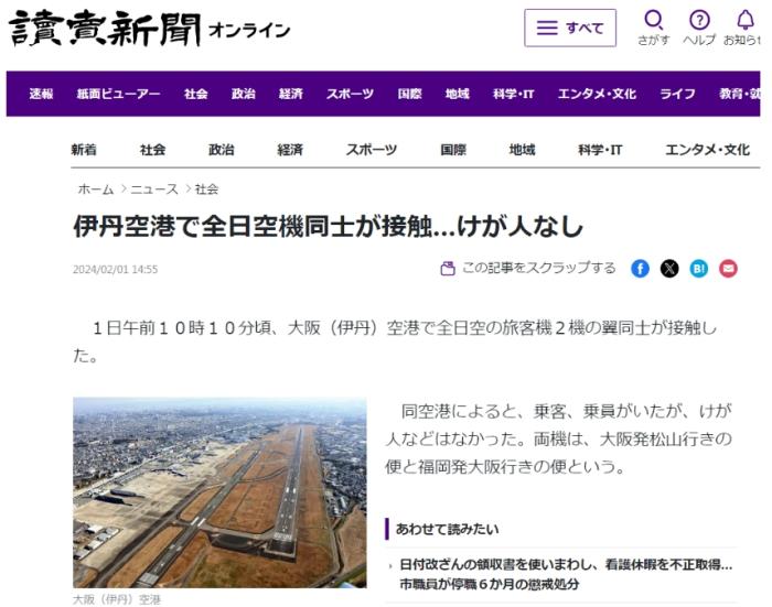 中新網2月1日電 據日本《讀賣新聞》報道,當地時間2月1日上午10時10分許,日本大阪伊丹機場的2架客機機翼部位發(fā)生擦碰。