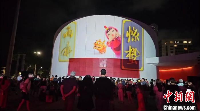 當天晚上,多娜·琳杜公園內(nèi)劇院的外墻,投影出中國文化元素燈光秀。畫面中,十二個生肖福娃次第給觀眾拜年,中國傳統(tǒng)時令節(jié)氣習俗一一展演,格外吸睛。