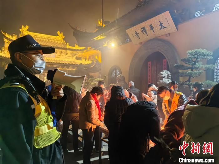 “太平禪寺零點前后達到瞬時人流高峰,人流量接近往年峰值人數(shù)的兩倍?!鄙虾J泄簿謱毶椒志诸櫞迮沙鏊L何相俊說。位于上海市寶山區(qū)太平禪寺的龍年撞鐘、燒頭香等活動,吸引了大量市民前來進香。為應(yīng)對2月9日晚至2月10日凌晨的短時大客流,顧村派出所在寺廟入口處增設(shè)了蛇形緩沖通道,預(yù)計可同時容納500人以上有序排隊入寺。