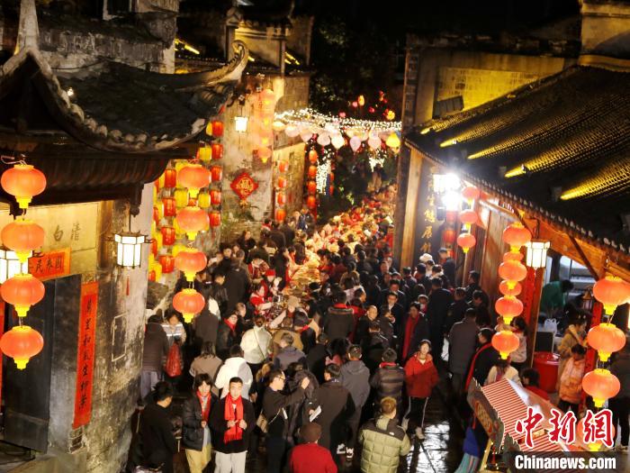 中新網(wǎng)懷化2月10日電 (付敬懿 李林)“開席咯,上頭碗,大吉大利,黃精燉雪峰烏骨雞;第二碗,前程似錦,黔陽雪粑鴨;第三碗,牛氣沖天,干鍋高山黃牛肉;第四碗,年年有余,黃燜昌齡魚……”2月9日晚,除夕夜,湖南懷化洪江市黔陽古城內(nèi),一張張桌子擺滿大街小巷,當(dāng)?shù)鼐用窈陀慰凸矅L長(zhǎng)龍宴,歡迎龍年到來。