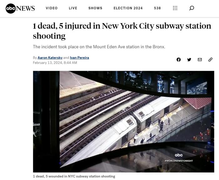 中新網(wǎng)2月13日電 據(jù)美國廣播公司(ABC)報道,當(dāng)?shù)貢r間12日下午,美國紐約布朗克斯一個地鐵站發(fā)生槍擊事件,造成1人死亡,5人受傷。