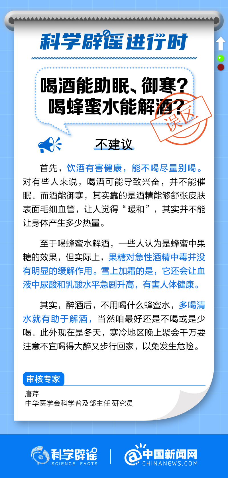 中新網(wǎng)2月13日電 飲酒有害健康,能不喝盡量別喝。對(duì)有些人來(lái)說(shuō),喝酒可能導(dǎo)致興奮,并不能催眠。而酒能御寒,靠的是酒精能夠舒張皮膚表面毛細(xì)血管,讓人覺(jué)得“暖和”,其實(shí)并不能讓身體產(chǎn)生多少熱量。至于喝蜂蜜水解酒,一些人認(rèn)為是蜂蜜中果糖的效果,但實(shí)際上,果糖對(duì)急性酒精中毒并沒(méi)有明顯的緩解作用。它還會(huì)讓血液中尿酸和乳酸水平急劇升高,有害人體健康。(來(lái)源:@科學(xué)辟謠 中國(guó)新聞網(wǎng)微博 )