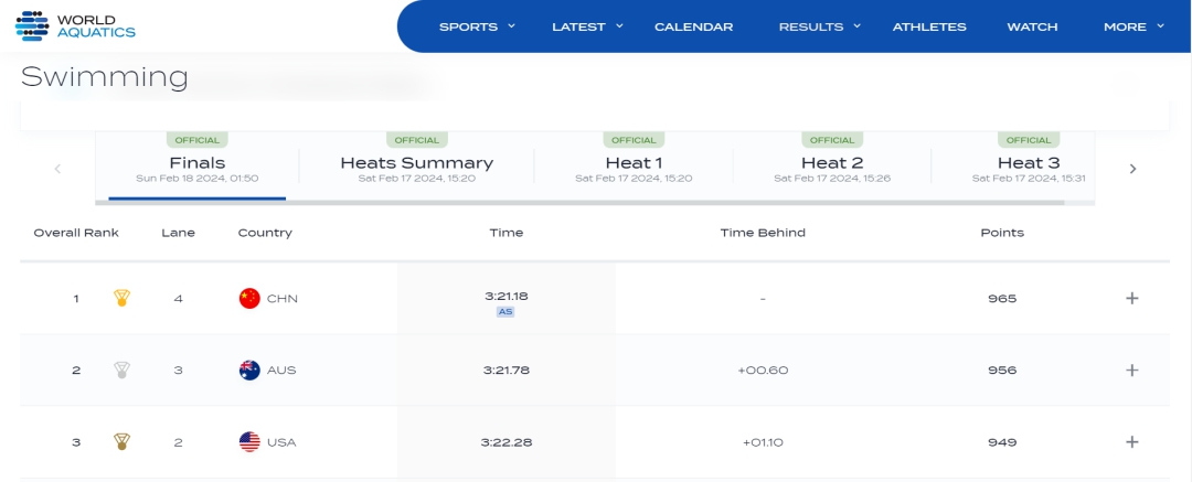 在預(yù)賽中,中國隊(duì)便狀態(tài)不俗,游出了3分24秒47的成績,打破了由日本隊(duì)保持的亞洲紀(jì)錄(3分24秒67),排名第一晉級決賽。