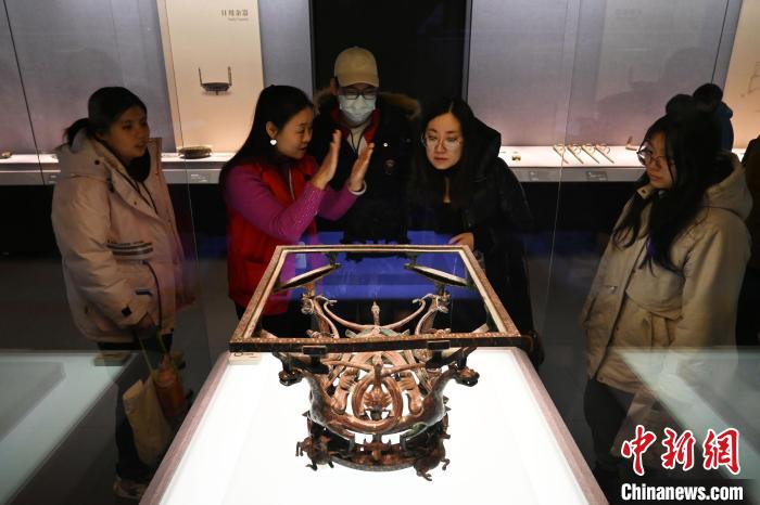 2月6日,民眾在河北博物院“戰(zhàn)國(guó)雄風(fēng) 古中山國(guó)”展廳參觀錯(cuò)金銀四龍四鳳銅方案座。 中新社記者 翟羽佳 攝