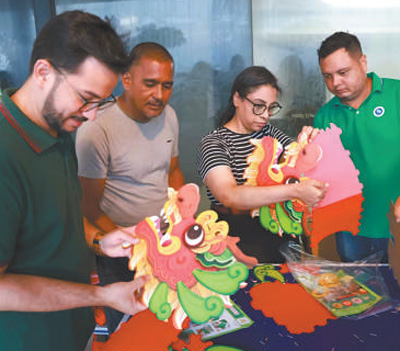 2月3日,巴西民眾在累西腓春節(jié)廟會(huì)活動(dòng)現(xiàn)場(chǎng)體驗(yàn)制作手工龍頭。