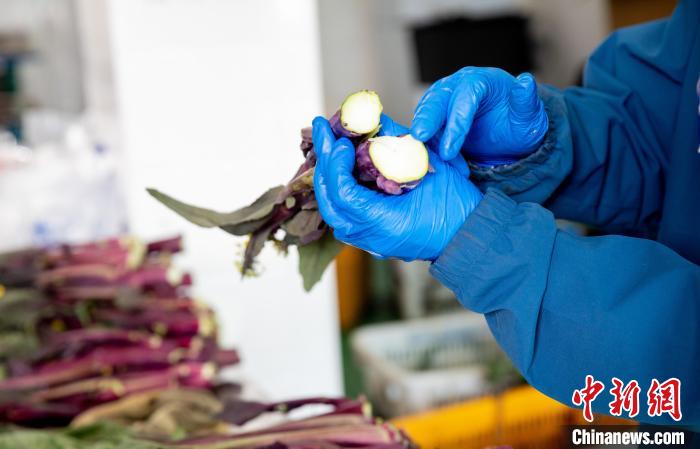 每天清早,趁露水未干,菜農(nóng)便穿梭于田壟間,長(zhǎng)勢(shì)繁茂的菜薹如女子手腕粗細(xì),葉片紅得發(fā)紫。菜農(nóng)手握掐刀,瞄準(zhǔn)基部輕輕一掐,汁水四溢,拭塵土、扒外皮,即可生食。若是經(jīng)歷寒風(fēng)雪霜,更是甘甜。