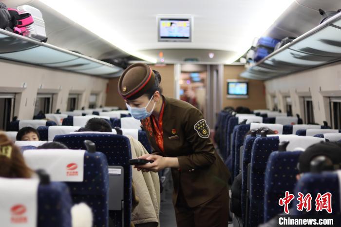 圖為在夜行高鐵上,列車乘務員掌握旅客到站信息,一對一進行到站提醒。徐雅婷攝