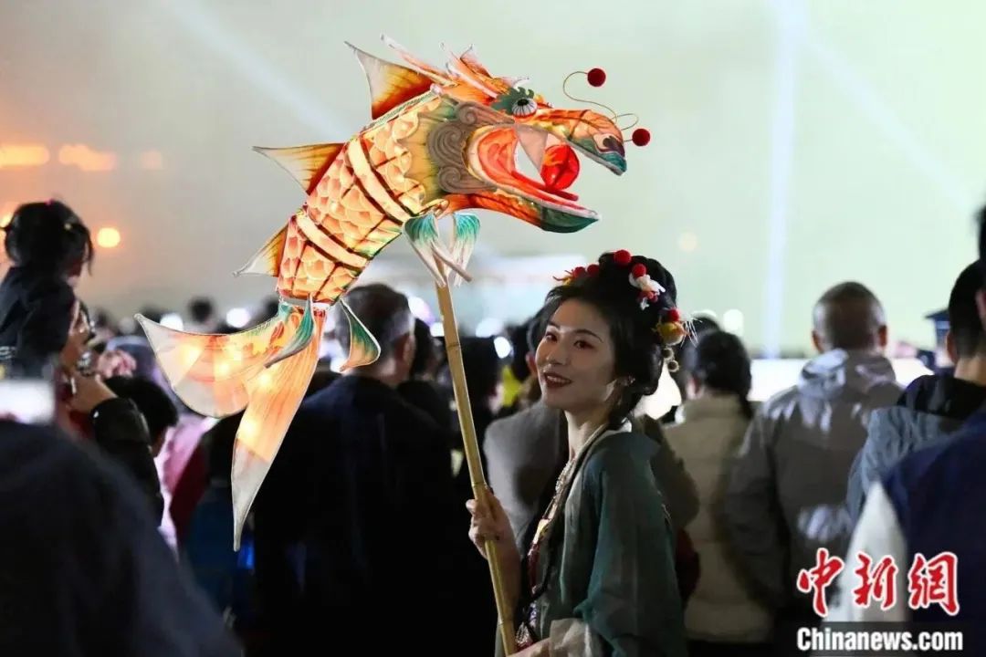 第二十二屆“兩馬同春鬧元宵”燈會(huì)上,市民手拿小龍燈游玩。中新社記者 王東明 攝