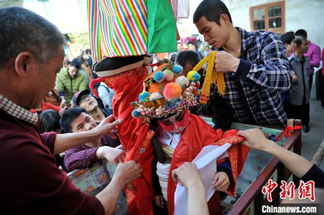 村民正在為參加“走古事”的兒童化妝穿衣。據(jù)了解,每個(gè)古事棚上有兩位身著戲袍,化上戲妝,扮成李世民、薛仁貴、劉邦、楊六郎、劉備等歷史人物的小朋友,入選的小朋友要求相貌端正,膽子大。中新社記者 張斌 攝