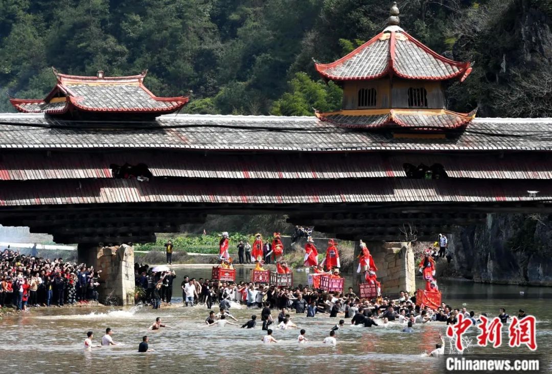 圖為村民抬著“古事棚”行進(jìn)在小河中。中新社記者 張斌 攝