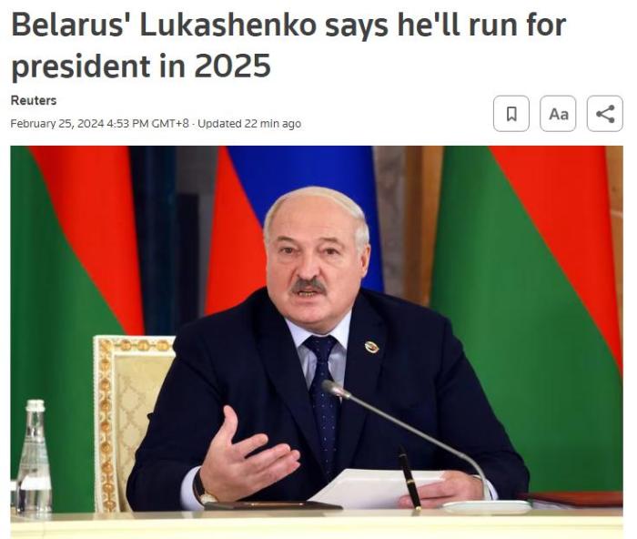 中新網(wǎng)2月25日電 據(jù)路透社援引白俄羅斯媒體25日報道,白俄羅斯總統(tǒng)盧卡申科表示,他計劃參加于2025年舉行的總統(tǒng)選舉。