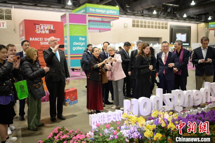 當(dāng)?shù)貢r間3月2日,一年一度的費(fèi)城花展在美國賓夕法尼亞州費(fèi)城開幕,以“功夫鄭州——花俏嵩山”為主題的鄭州展園當(dāng)天在花展上亮相。圖為中國駐紐約總領(lǐng)事黃屏(右三)帶領(lǐng)嘉賓參觀鄭州展園?!ranck Zhou 攝