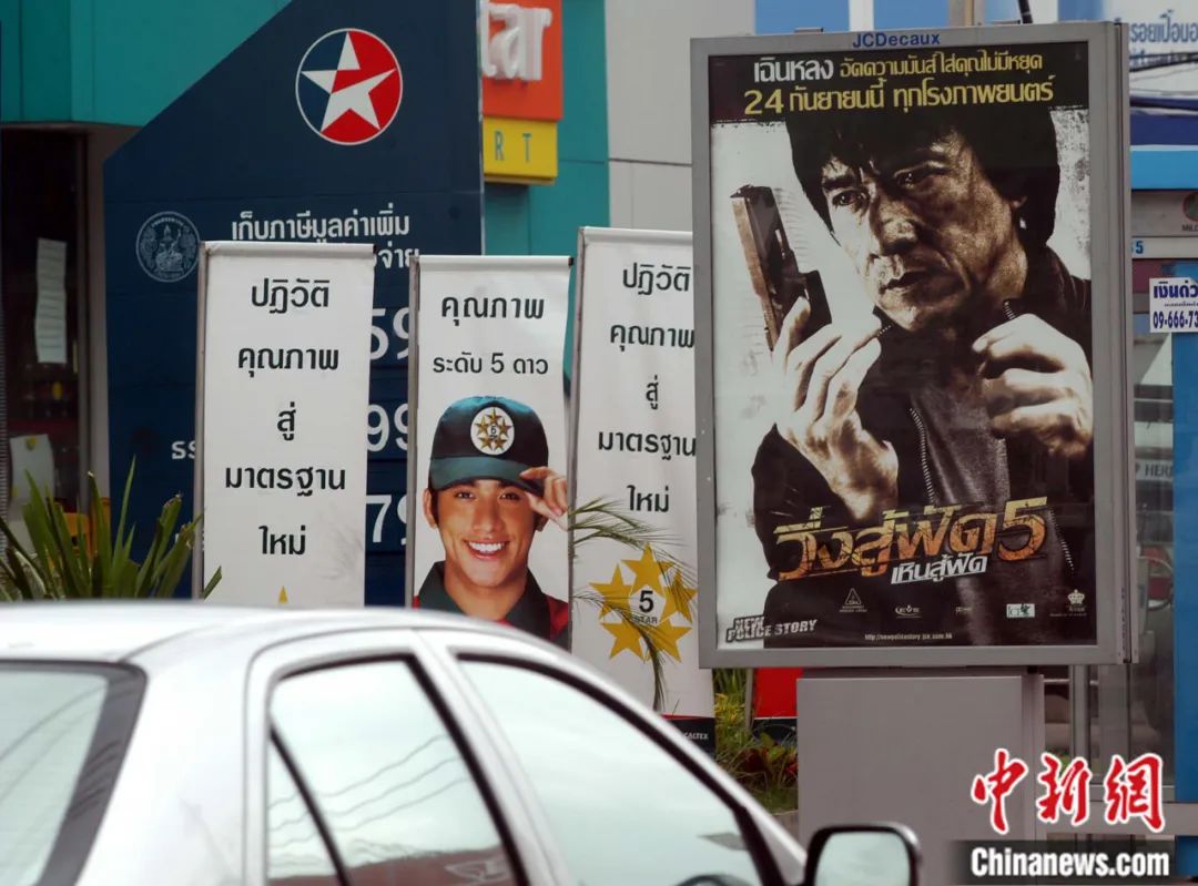2004年,泰國(guó)曼谷主要街道上張貼的成龍主演電影《新警察故事》宣傳海報(bào)。張宇 攝