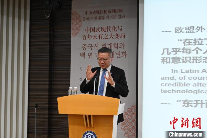 3月13日,復(fù)旦大學(xué)特聘教授、復(fù)旦大學(xué)中國研究院院長張維為以“百年未有之大變局與中國式現(xiàn)代化”為主題在韓進(jìn)行演講。首爾中國文化中心 供圖