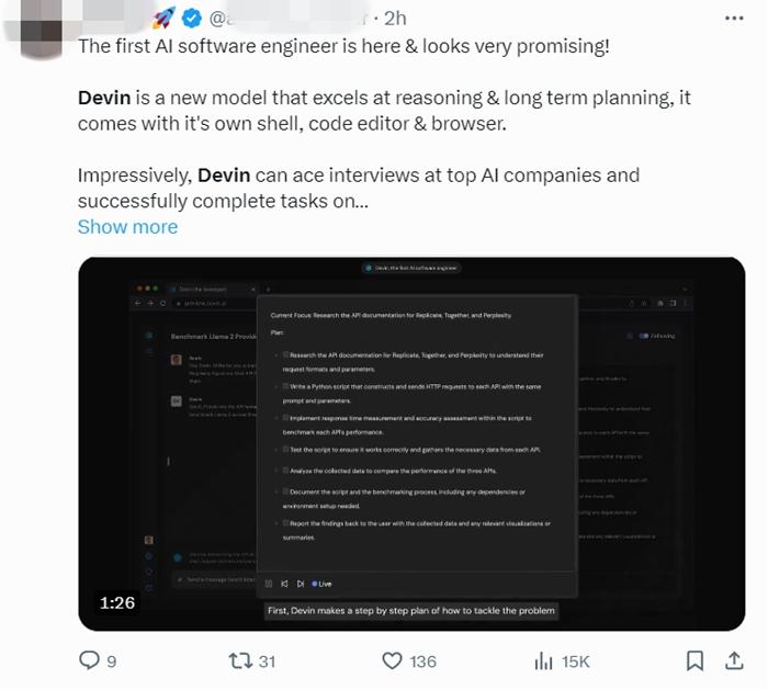 “第一位AI工程師看起來很有希望,令人印象深刻的是,Devin可以在頂級AI公司的面試中脫穎而出,并且成功地完成了任務(wù)?!庇腥斯ぶ悄軐<以谏缃黄脚_分享觀點(diǎn)。多個Devin編程的視頻也在網(wǎng)絡(luò)流傳。