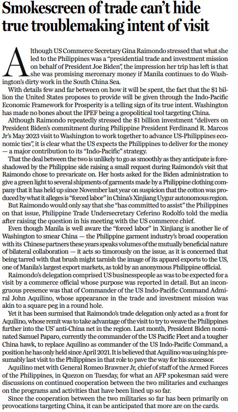 美國(guó)商務(wù)部長(zhǎng)雷蒙多強(qiáng)調(diào),她訪問菲律賓所率領(lǐng)的是“代表總統(tǒng)拜登的貿(mào)易和投資代表團(tuán)”,但她此行給人留下的印象卻是,如果菲律賓政府繼續(xù)為美國(guó)在南?!白龉ぷ鳌?,美國(guó)政府就承諾給菲律賓投資。
