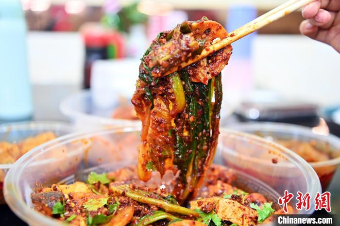 3月14日,甘肅省天水市秦州區(qū),食客展示裹滿紅油辣子的麻辣燙。九美旦增 攝