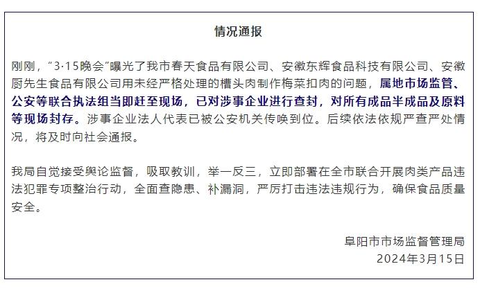 涉事企業(yè)所在的阜陽(yáng)市市場(chǎng)監(jiān)督管理局當(dāng)晚發(fā)布情況通報(bào)稱,屬地市場(chǎng)監(jiān)管、公安等聯(lián)合執(zhí)法組當(dāng)即趕至現(xiàn)場(chǎng),已對(duì)涉事企業(yè)進(jìn)行查封,對(duì)所有成品半成品及原料等現(xiàn)場(chǎng)封存。涉事企業(yè)法人代表已被公安機(jī)關(guān)傳喚到位。后續(xù)依法依規(guī)嚴(yán)查嚴(yán)處情況,將及時(shí)向社會(huì)通報(bào)。