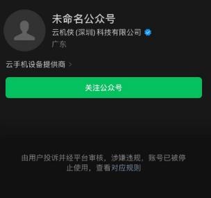 涉及主板機(jī)黑灰產(chǎn)業(yè)鏈的云機(jī)俠(深圳)科技有限公司,其微信公眾號(hào)顯示涉嫌違規(guī),賬號(hào)已被停止使用;其短視頻賬號(hào)已被相關(guān)平臺(tái)封禁;該公司官網(wǎng)目前也不能打開。