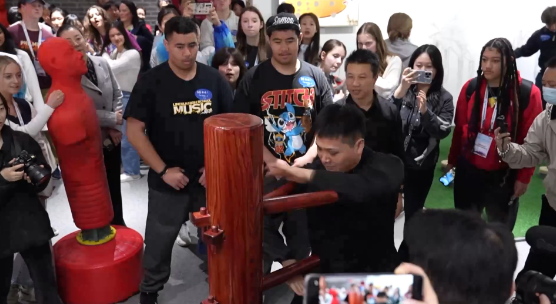 詠春拳木人樁、梅花樁、長矛等武術(shù)表演,引來代表團(tuán)中的學(xué)生們踴躍體驗。
