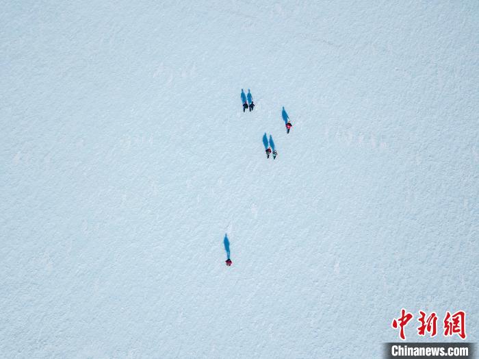 藍冰上的科學家、野外向?qū)Ш陀浾?。照片攝于智利南極研究所(INACH)2022年對南極洲埃爾斯沃斯山脈聯(lián)合冰川的實地考察(圖片來自智利圣地亞哥大學Jose Jorquera)。施普林格·自然/供圖
