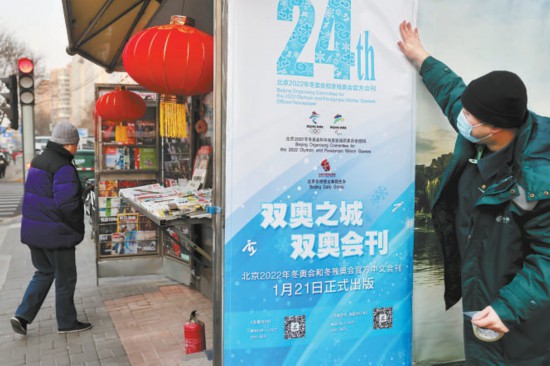 昨天上午,位于廣渠門內(nèi)大街富貴園購物中心前的郵政報(bào)刊亭旁,三位來自北京郵政的工作人員正忙碌著。很快,三張印有“雙奧之城,雙奧會刊”“北京2022年冬奧會和冬殘奧會官方中文會刊1月21日正式出版”等字樣的嶄新海報(bào)貼上了報(bào)刊亭的公益宣傳欄。以白色和藍(lán)色為主色調(diào)的主題海報(bào)剛剛貼好,就立刻吸引了過往路人的駐足觀看:“這海報(bào)真有冬奧氛圍?!薄岸瑠W會刊?到時(shí)候得來一份看看?!辈簧俾啡颂统鍪謾C(jī),對著海報(bào)上的預(yù)訂二維碼現(xiàn)場掃碼,了解具體情況。