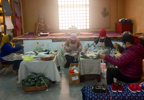 北莊團結手工坊工人在納鞋底。 實習生 駱金瑾攝