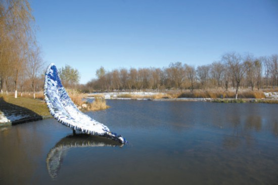 在通州區(qū)城市綠心森林公園的水系中,也有一件為冬奧會新創(chuàng)作的公共藝術(shù)作品《舟》。它看起來如同一葉代表“同舟共濟(jì)”的輕舟,也像一根羽毛、一片象征著和平與友誼的橄欖葉。走近仔細(xì)看,雕塑由許多鵝卵石般的陶瓷顆粒組成。它由中國藝術(shù)研究院雕塑家張冕、郅敏合作,是北京冬奧會公共藝術(shù)作品征集活動評選出的最佳作品之一。