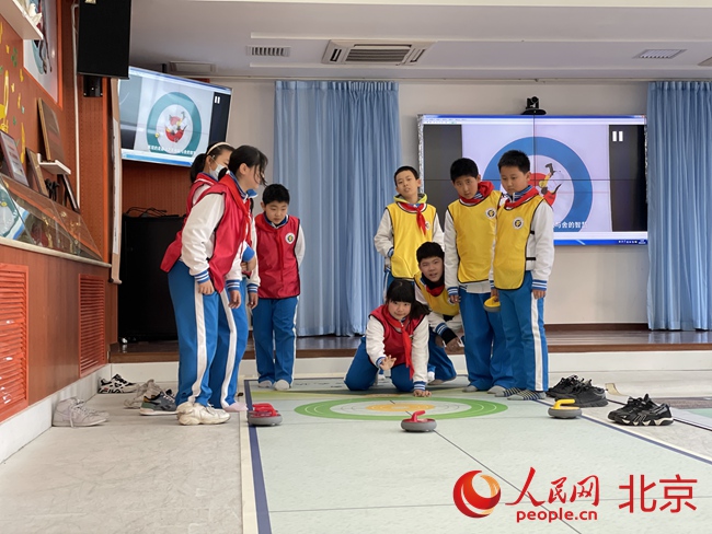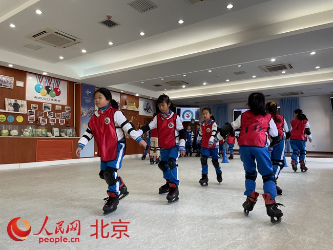 海淀首個(gè)小學(xué)“冰雪教室”亮相,可進(jìn)行冰壺、短道速滑等項(xiàng)目。人民網(wǎng) 董兆瑞攝