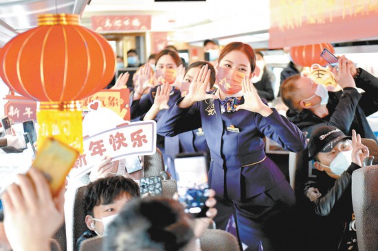 1月16日,合肥客運(yùn)段工作人員在G7162次列車上為旅客表演節(jié)目,讓旅途充滿溫情。2022年春運(yùn)從1月17日開始,2月25日結(jié)束,共計(jì)40天。 新華社記者 黃博涵攝