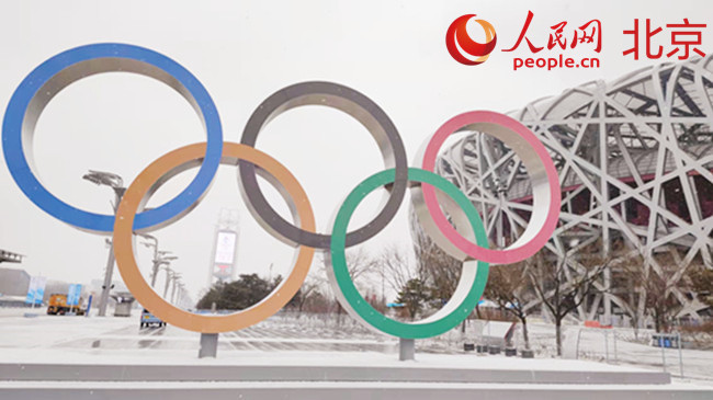位于“鳥巢”西側的“奧運五環(huán)”形象景觀。 人民網(wǎng) 李博攝