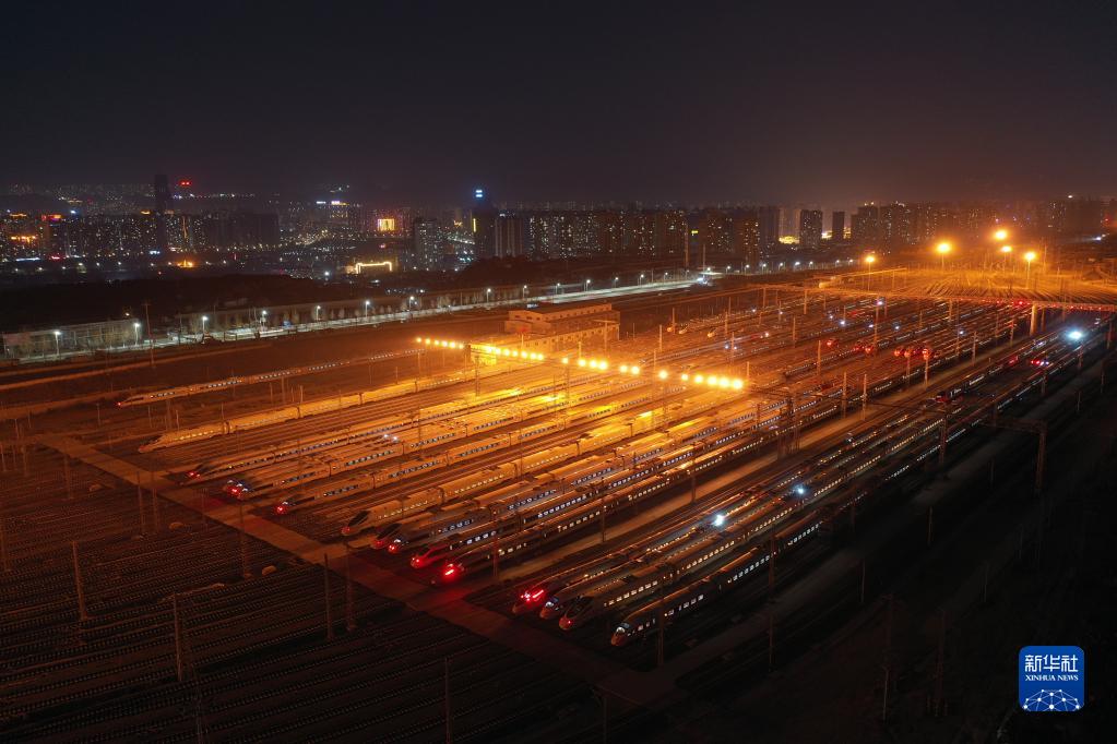 1月16日晚,動車組列車停靠在中國鐵路蘭州局集團有限公司蘭州車輛段蘭州西動車運用所整備場上,為1月17日開始的2022年春運做好準(zhǔn)備(無人機照片)。新華社記者 杜哲宇 攝