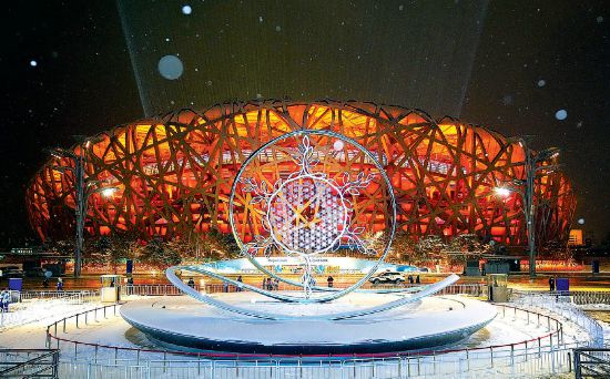 雪夜,北京賽區(qū)頒獎廣場“雪花”火炬展示臺與鳥巢交相輝映。 本報記者 方非攝