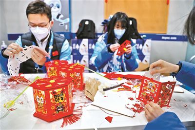 昨天是中國的傳統(tǒng)節(jié)日元宵佳節(jié),國家體育館開展了豐富多彩的慶祝活動,當(dāng)天場館餐廳提供了湯圓,場館禮賓部工作人員向外賓介紹中國吃湯圓的由來和寓意,并邀請大家品嘗。在志愿者之家內(nèi),彩燈高懸,充滿歡聲笑語,志愿者們做燈籠、猜燈謎,共同度過一個歡樂祥和的元宵節(jié)。圖為冬奧志愿者在制作花燈。文并攝/本報(bào)記者 黑建軍
