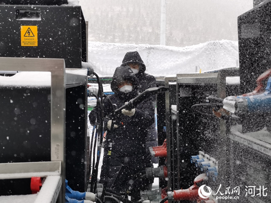 暴雪中,國網(wǎng)冀北電力場館電力保障隊(duì)員來到云頂滑雪公園巡視供電設(shè)備。 欒志成攝