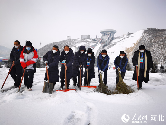國家冬季兩項(xiàng)電力保障團(tuán)隊(duì)在暴雪中清理積雪,確保設(shè)備健康。 馬錚攝