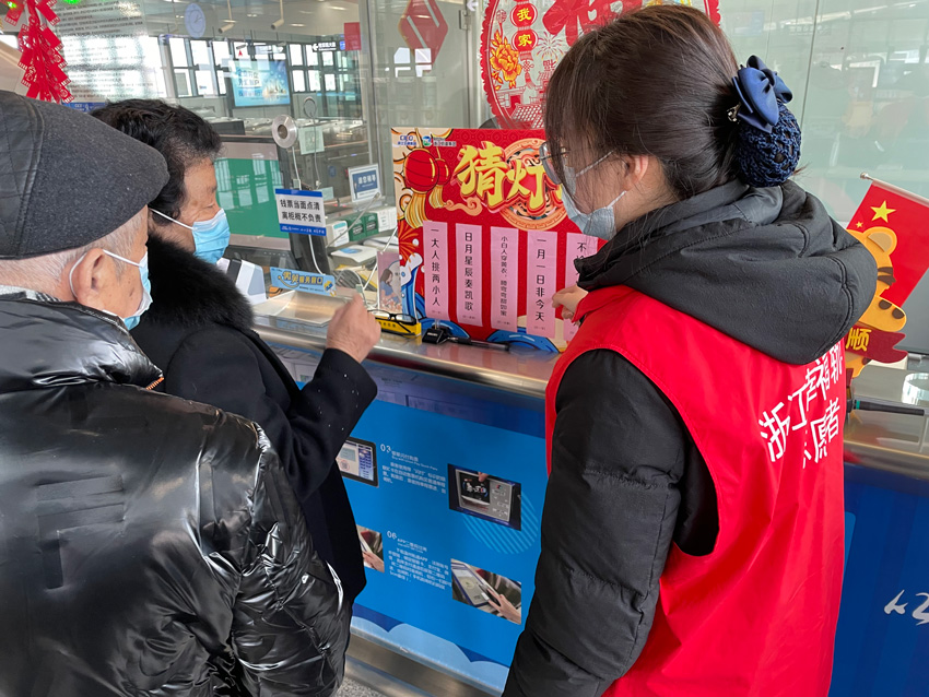 在各車(chē)站的客服中心外的燈謎展板上貼滿了各式各樣的燈謎,乘客們停下腳步,在工作人員的指引下猜起燈謎。