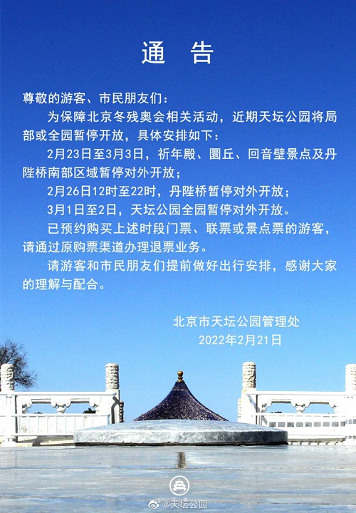 人民網(wǎng)北京2月22日電 2月21日,天壇公園管理處發(fā)布通告稱,為保障北京冬殘奧會相關(guān)活動,近期天壇公園將局部或全園暫停開放。