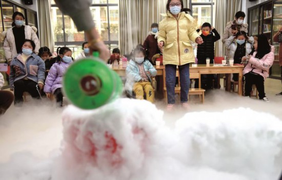 日前,嘉興市秀洲區(qū)高照街道秀清社區(qū)請(qǐng)來(lái)科技館老師,將兒童科學(xué)實(shí)驗(yàn)課堂搬到社區(qū),讓孩子們?cè)诩议T口就能上有趣又好玩的科學(xué)實(shí)驗(yàn)課。(馮玉坤)