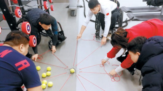 徐守森(右一)帶領(lǐng)輪椅冰壺運動員通過互動游戲緩解比賽壓力。