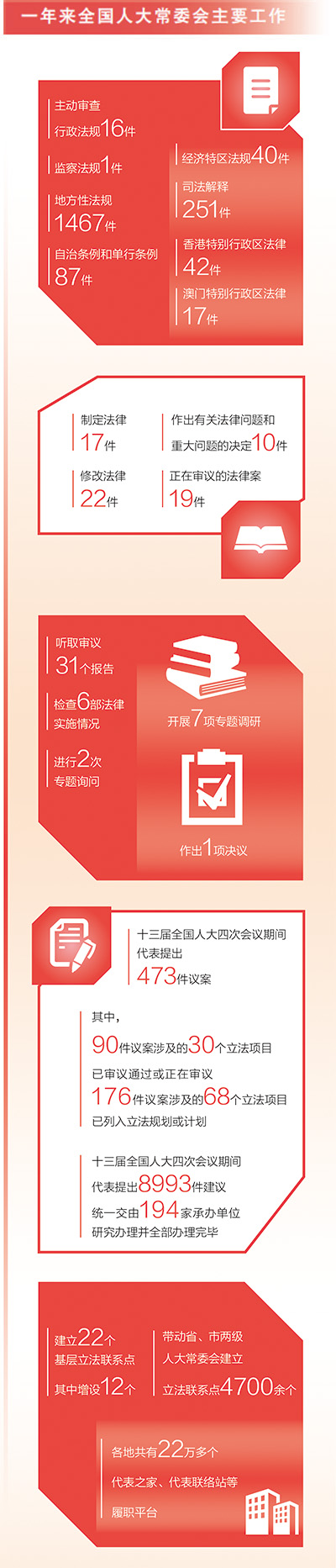一年來,全國人大常委會(huì)制定法律17件,修改法律22件,作出有關(guān)法律問題和重大問題的決定10件,正在審議的法律案19件。