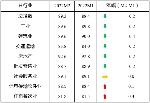 其中,分行業(yè)指數2升1平5降,分項指數2升6降。在8個分行業(yè)指數中,升幅較大的為住宿餐飲業(yè)指數,上升0.3點;降幅較大的為建筑業(yè)指數,下降0.4點。在8個分項指數中,升幅較大的為資金指數,上升0.4點;降幅較大的為成本指數和投入指數,均下降0.7點。