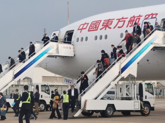 3月10日下午,在滬全國政協(xié)委員乘東航班機返滬。上海市政協(xié)供圖
