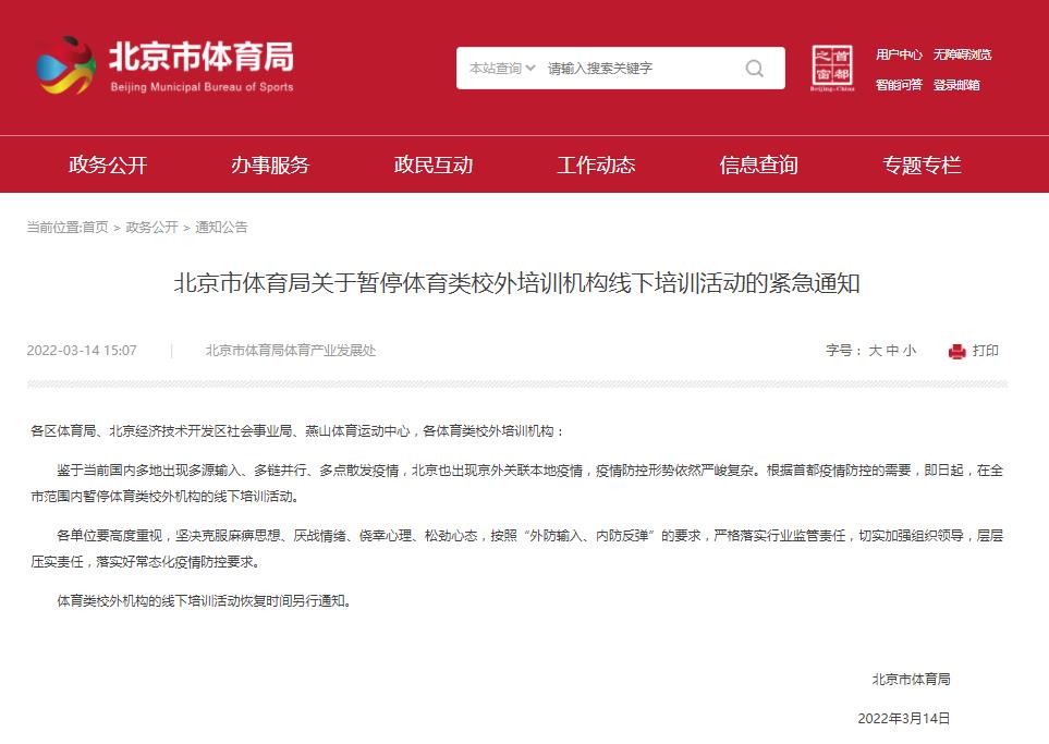 北京:全市范圍內(nèi)暫停體育類校外機構(gòu)的線下培訓(xùn)活動