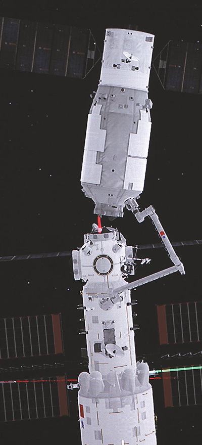 在北京航天飛行控制中心拍攝的空間站機械臂轉(zhuǎn)位貨運飛船試驗畫面,天舟二號貨運飛船在機械臂拖動下,以核心艙節(jié)點艙球心為圓心進行平面轉(zhuǎn)位。