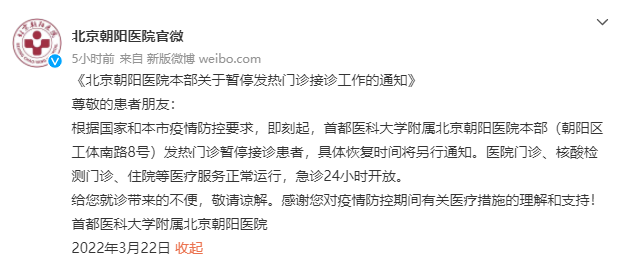北京朝陽醫(yī)院本部發(fā)熱門診暫停接診患者