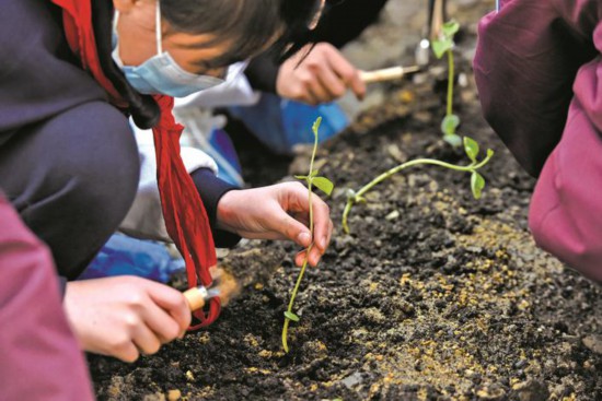 3月23日,嘉興一學(xué)校種植園,學(xué)生們在各班的“責(zé)任田”里忙著種植各種蔬菜和花卉。學(xué)校希望通過豐富多彩的種植活動,讓孩子們在親近植物、探究植物的過程中,提升綜合探究學(xué)習(xí)能力,同時也更好地推進(jìn)學(xué)?!半p減”政策的落地。(馮玉坤)